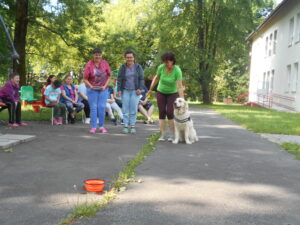 Canisterapeutická návštěva probíhá většinou tak, že se každý uživatel s Dorkou přivítá většinou pohlazením nebo podáním packy, pak následují různorodé aktivity, které paní Fejkusová průběžně obměňuje. Mezi oblíbené činnosti našich klientů s pejskem patří, česání masážní rukavicí, vedení na vodítku, přecházení přes či kolem ležícího pejska, házení míčku, nebo zajímavé úlohy, kdy pejsek například hledá pamlsek pod kelímky, ve čmuchacím koberečku nebo přímo v hlavolamu, který je ke hledání pamlsků určený. U každé hry s pejskem se vždy uživatvatelé vystřídají a s úsměvem na rtu se pokaždé účastní další následující akce. Závěrem se pak Dorka se všemi rozloučí, nechá se pohladit, přímo si lehne někomu do klína nebo si uživatel lehne na ni, položí si hlavu a ve společném souznění vnímají jeden druhého. Rádi si užíváme tenhle smysluplně strávený čas a děkujeme za něj.