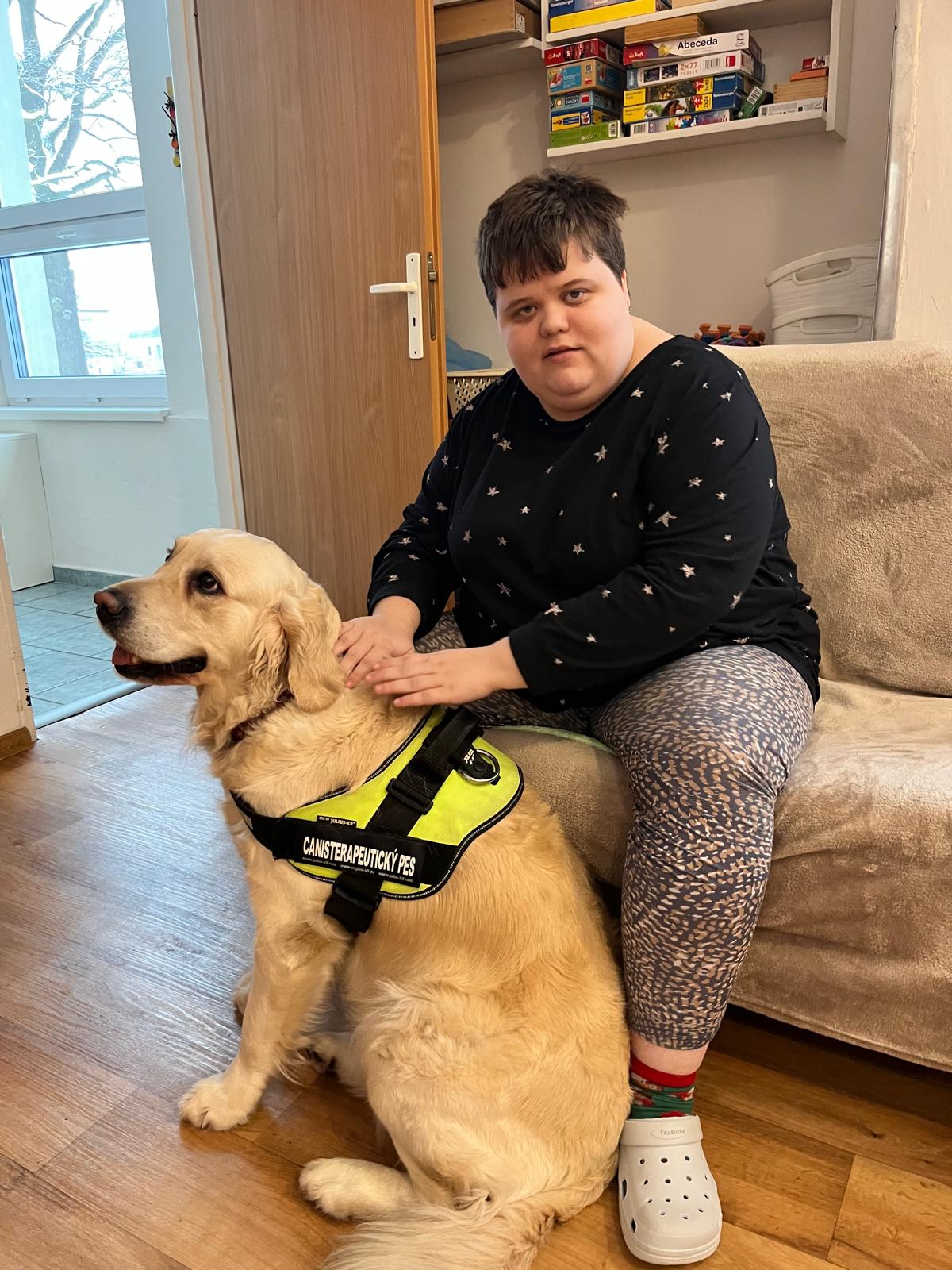 Již dlouhodobě a pravidelně navštěvuje naše zařízení paní Fejkusová nyní aktuálně s canisterapitickou fenkou zlatého retrívra Dorkou. U našich uživatelů se jejich návštěva vždy setkává s velkým úspěchem. Dokonce i klient, který má v běžném prostředí panický strach z pejsků, se do kontaktních činností s pejskem aktivně zapojuje. Canisterapeutická návštěva probíhá většinou tak, že se každý uživatel s Dorkou přivítá většinou pohlazením nebo podáním packy, pak následují různorodé aktivity, které paní Fejkusová průběžně obměňuje. Mezi oblíbené činnosti našich klientů s pejskem patří, česání masážní rukavicí, vedení na vodítku, přecházení přes či kolem ležícího pejska, házení míčku, nebo zajímavé úlohy, kdy pejsek například hledá pamlsek pod kelímky, ve čmuchacím koberečku nebo přímo v hlavolamu, který je ke hledání pamlsků určený. U každé hry s pejskem se vždy uživatelé vystřídají a s úsměvem na rtu se pokaždé účastní další následující akce. A i když se někdo přímo nezapojí do společné aktivity, většinou s nadšením pozoruje alespoň Dorku, která ochotně plní všemožné úkoly.